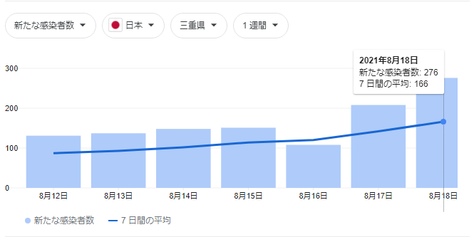 今も猛威を振るっている新型コロナウイルスですが、三重県でも新たな感染者数が276名と増加しています。(8月18日時点 提供元:JHU CSSE COVID-19 Data)