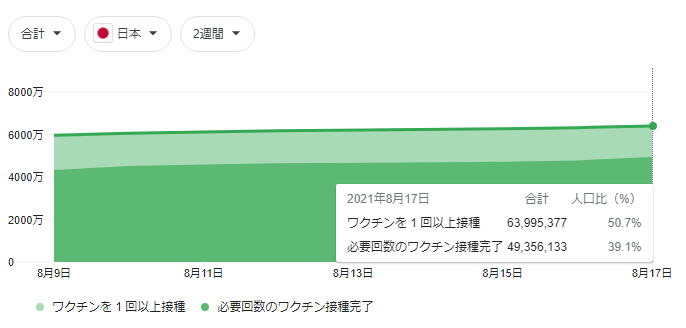 現在 日本ではワクチンを1回以上接種している人は約6,400万人で50.7%、必要回数の接種が完了している人は約4,900万人で39.1%となっています。(提供元:Our World in Data)